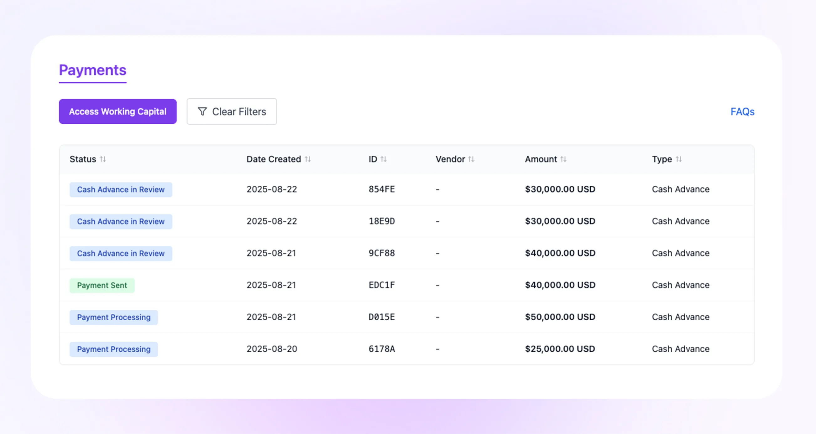 Capital lands in your account in as little as 24 hours. Spend it however you choose: ads, operations, suppliers.