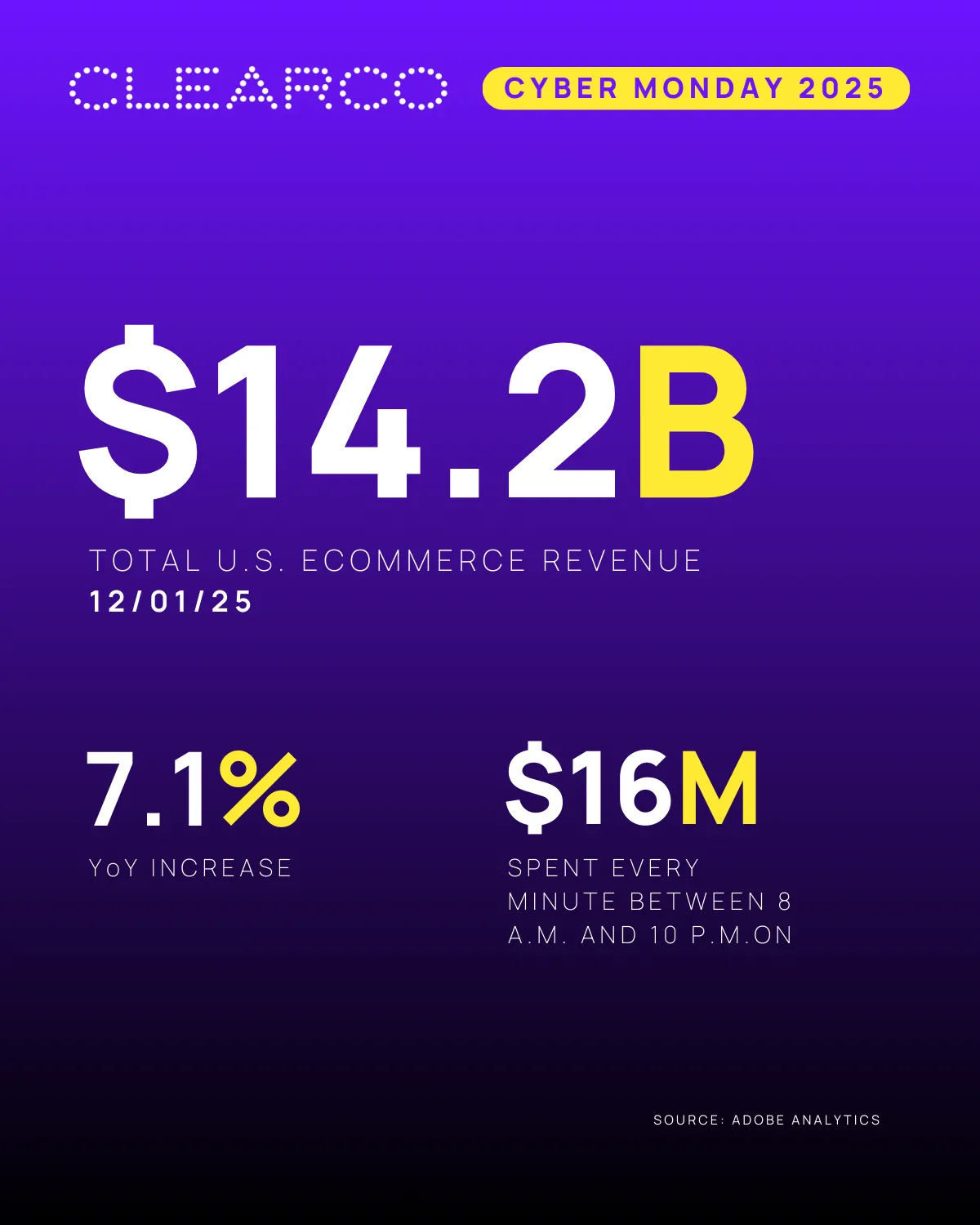 Cyber Monday 2025 reinforced its position as one of the biggest spending days in ecommerce. Cyber Week data shows another record-shattering performance with $14.2B USD in Cyber Monday sales and $44.2B USD across the broader Cyber 5 period.